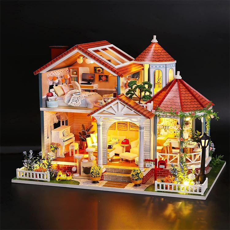 DIY miniatūra mēbeļu koka leļļu māja vairāk atbilst bērnu estētikai un bērnu istabas stilam. Durvis, logus un jumtus var atvērt, un atskaņojamība ir ļoti augsta. Atbalsta mēbeļu cena ir mērena. Tajā ir 10 dažādu mēbeļu un aksesuāru komplekts, un jūsu bērni var izbaudīt savu radošumu šajā mājā. Šī leļļu māja ir īpaši paredzēta 30 cm lellēm, kas ir pietiekami liela, lai tajā varētu ievietot jau esošās lelles.